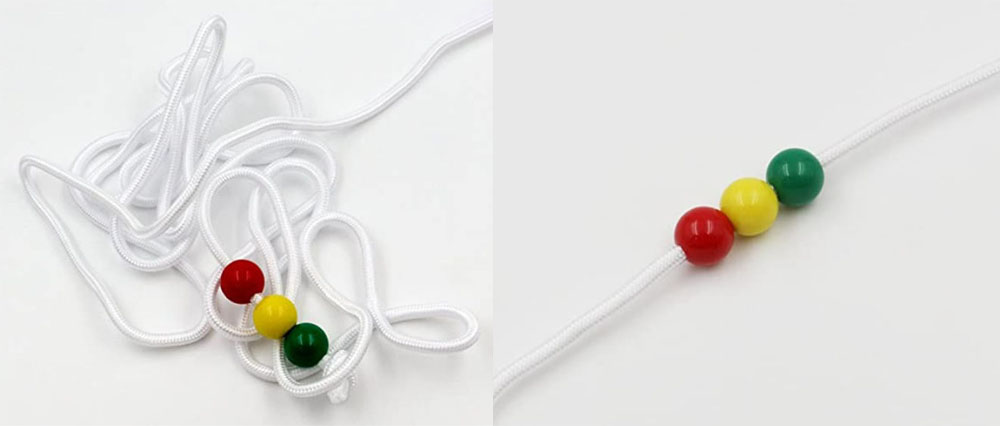 Puedes comprarla hecha o fabricarla en casa, simplemente es una cuerda o cordón un poco gordito de color blanco (o de un color claro) de un metro de largo más o menos y tres bolas de colores, las puedes comprar en las tiendas tipo chino, bazar, tiger…